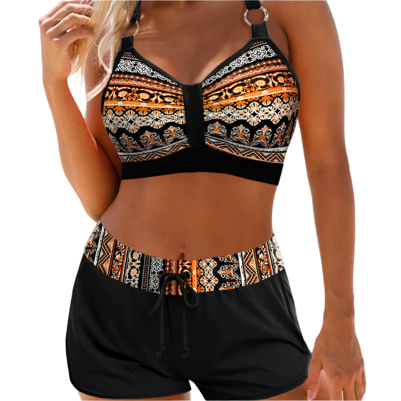 - Etnický potisk: Horní část a pas kraťasů vynikají kmenovými vzory v oranžových a černých tónech, které dodávají styl a originalitu.