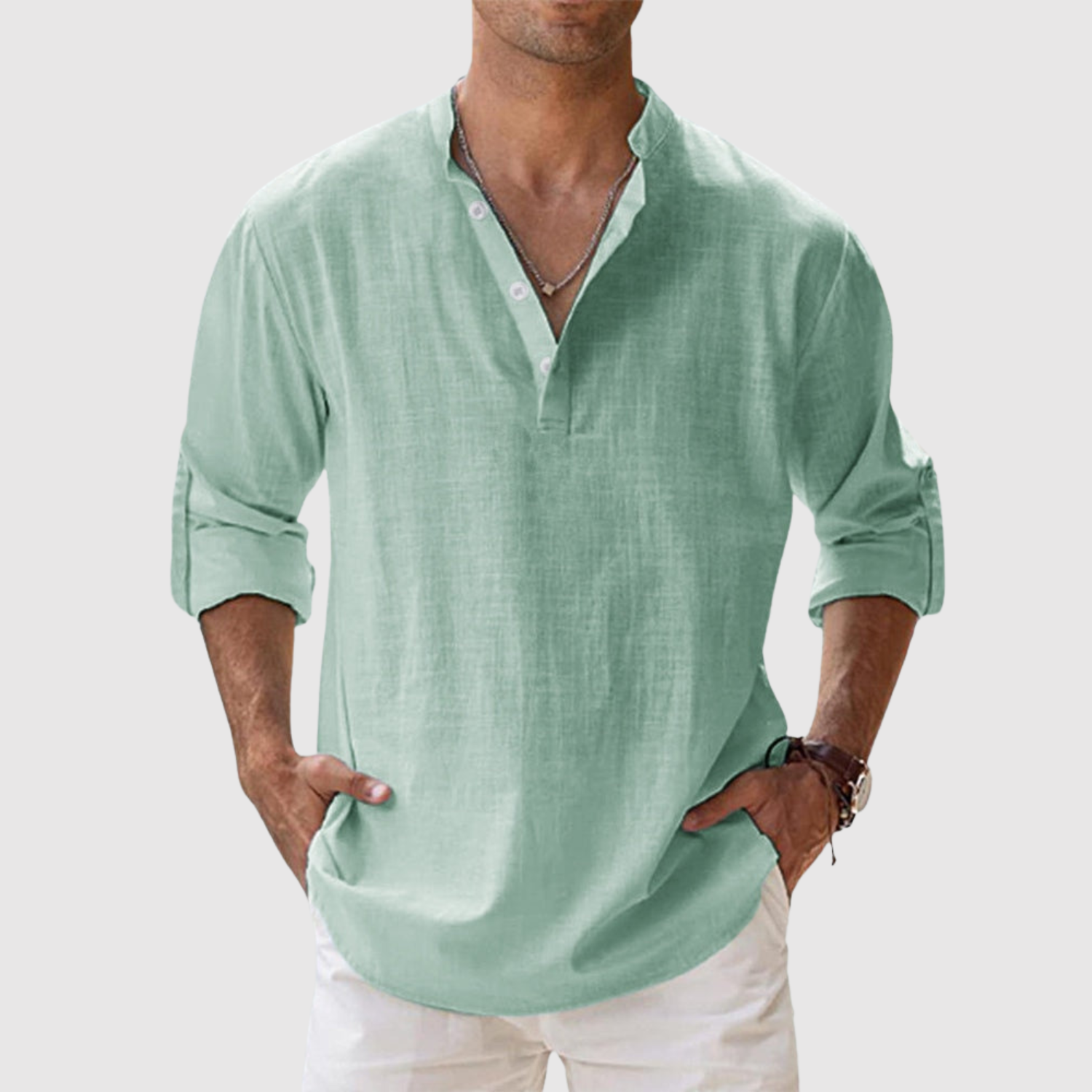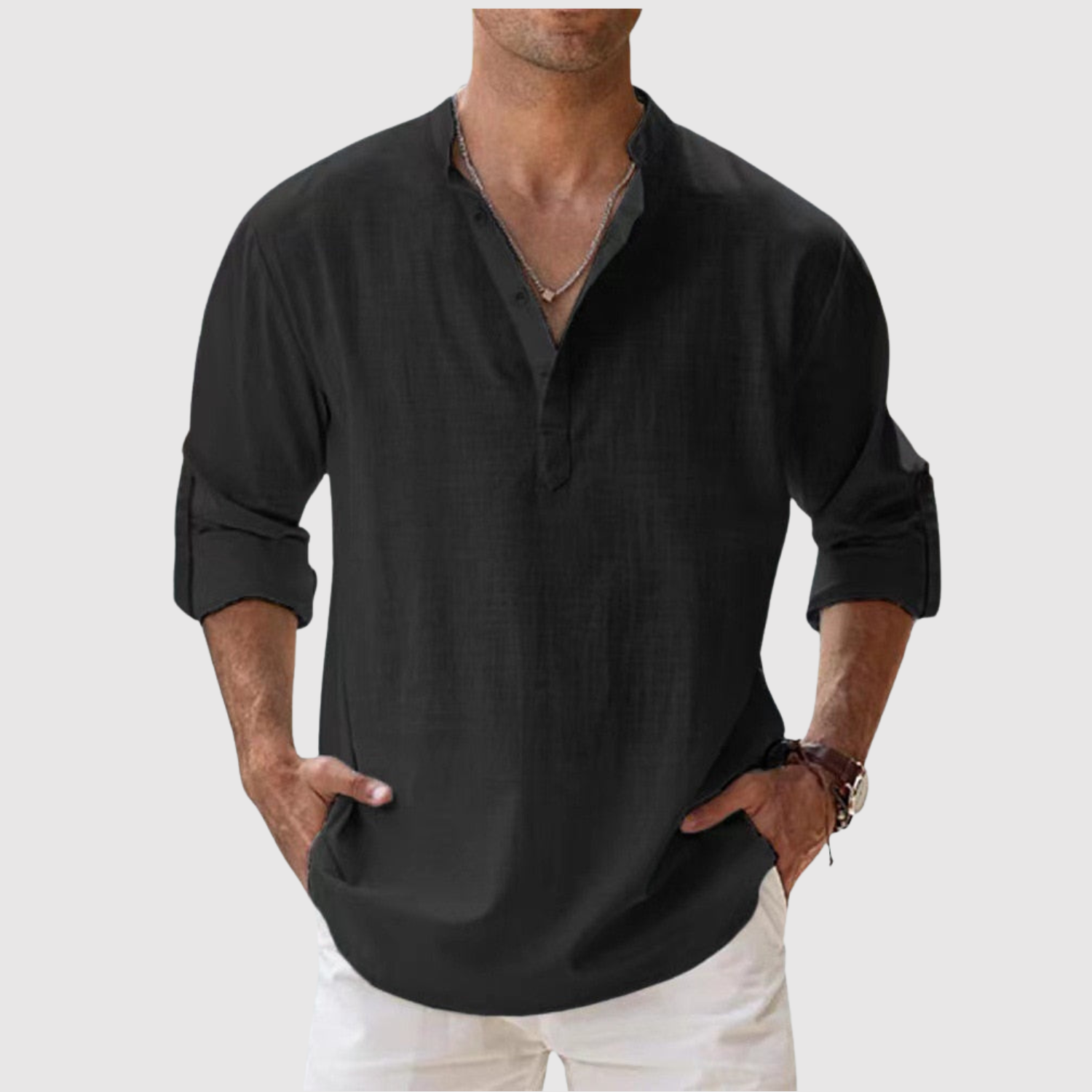 Naše lněná košile je určena pro muže, kteří hledají svěží a moderní vzhled, aniž by se vzdali pohodlí. Díky volnému střihu a univerzálnímu designu je ideální jak na procházky po pláži, tak pro ležérní městský styl. Lehká a prodyšná tkanina zajišťuje pohodlí po celý den, zatímco design s otevřeným límcem a dlouhými rukávy, které lze vyhrnout, z ní dělá praktický a nadčasový kousek.