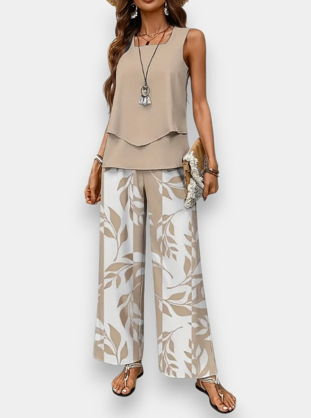 Ultralehký set kombinuje eleganci a pohodlí ve dvoudílném setu s bezchybným stylem. Lehký top a volné kalhoty s potiskem listů nabízejí ležérně-elegantní vzhled, který je ideální pro každou příležitost. Ideální na letní dny, dovolenou nebo speciální události.
