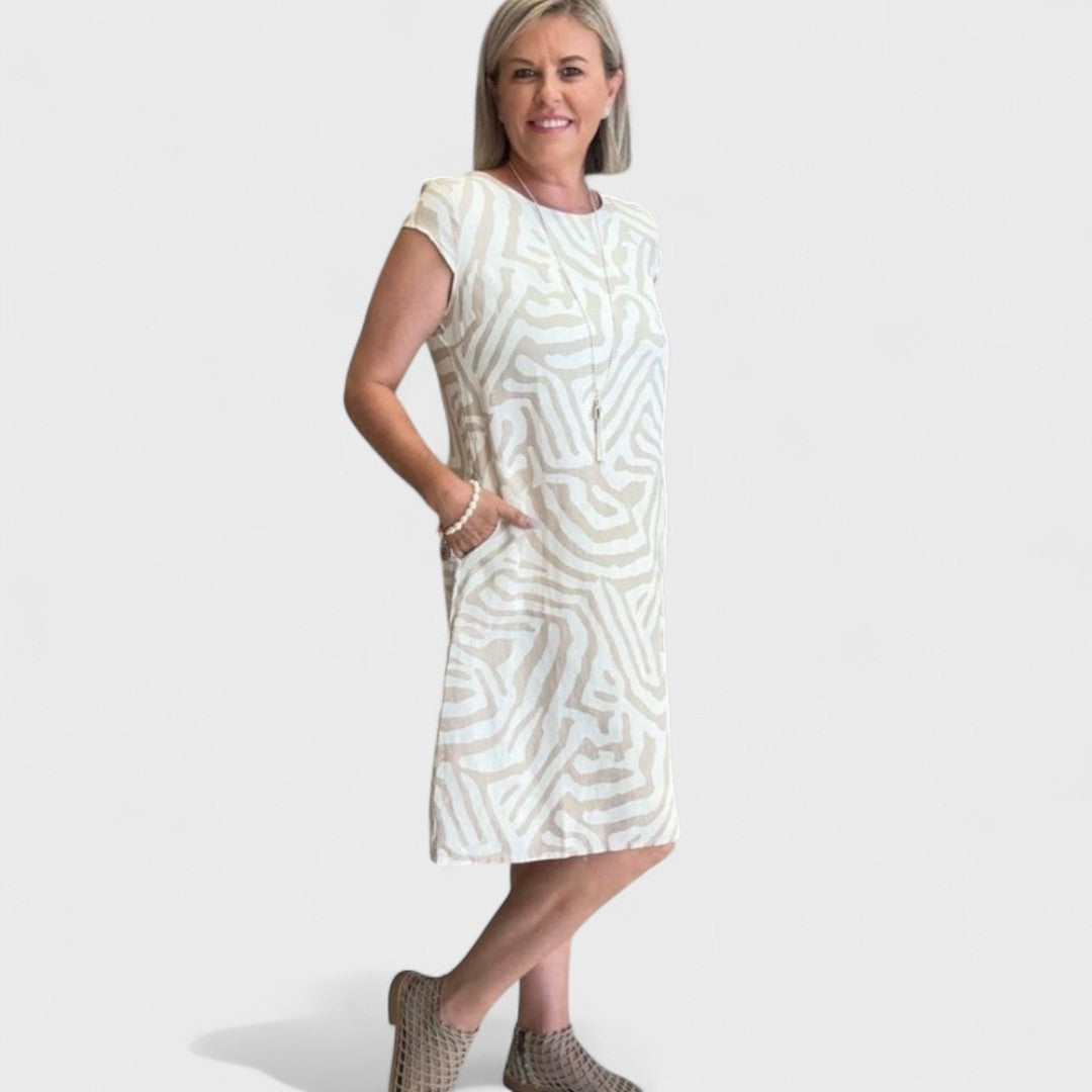 Šaty Nelia nabízejí příjemně padnoucí střih s jemným kulatým výstřihem a volnou sukní, která elegantně splývá při každém kroku. Květinový či stylový grafický potisk v jemných barvách dodává vzhledu svěžest a hravost. Ideální volba pro příjemné dny ve městě, zahradní oslavy nebo relaxaci u kávy.