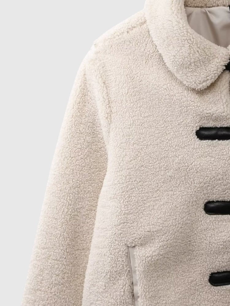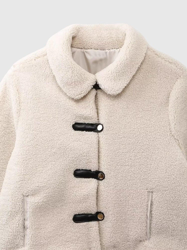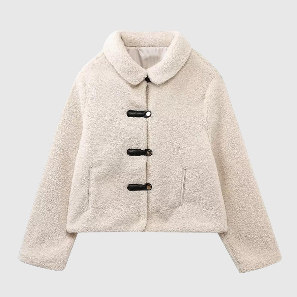 • Ozdobné zapínání – Tři poutka s knoflíky dodávají bundě charakter a řemeslný detail.