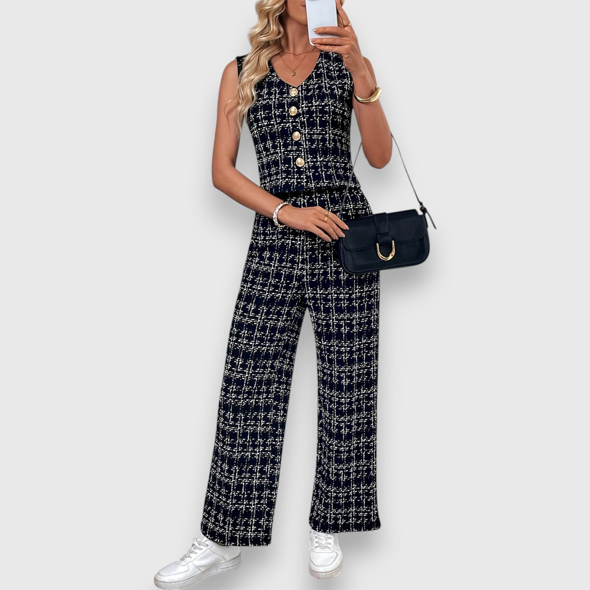 Sada Serina ohromuje elegantním kostkovaným vzorem a moderním, štíhlým střihem. Skládá se z bezramenného topu s V-výstřihem a odpovídajících kalhot, nabízí pohodlí a styl pro každodenní i formální příležitosti.