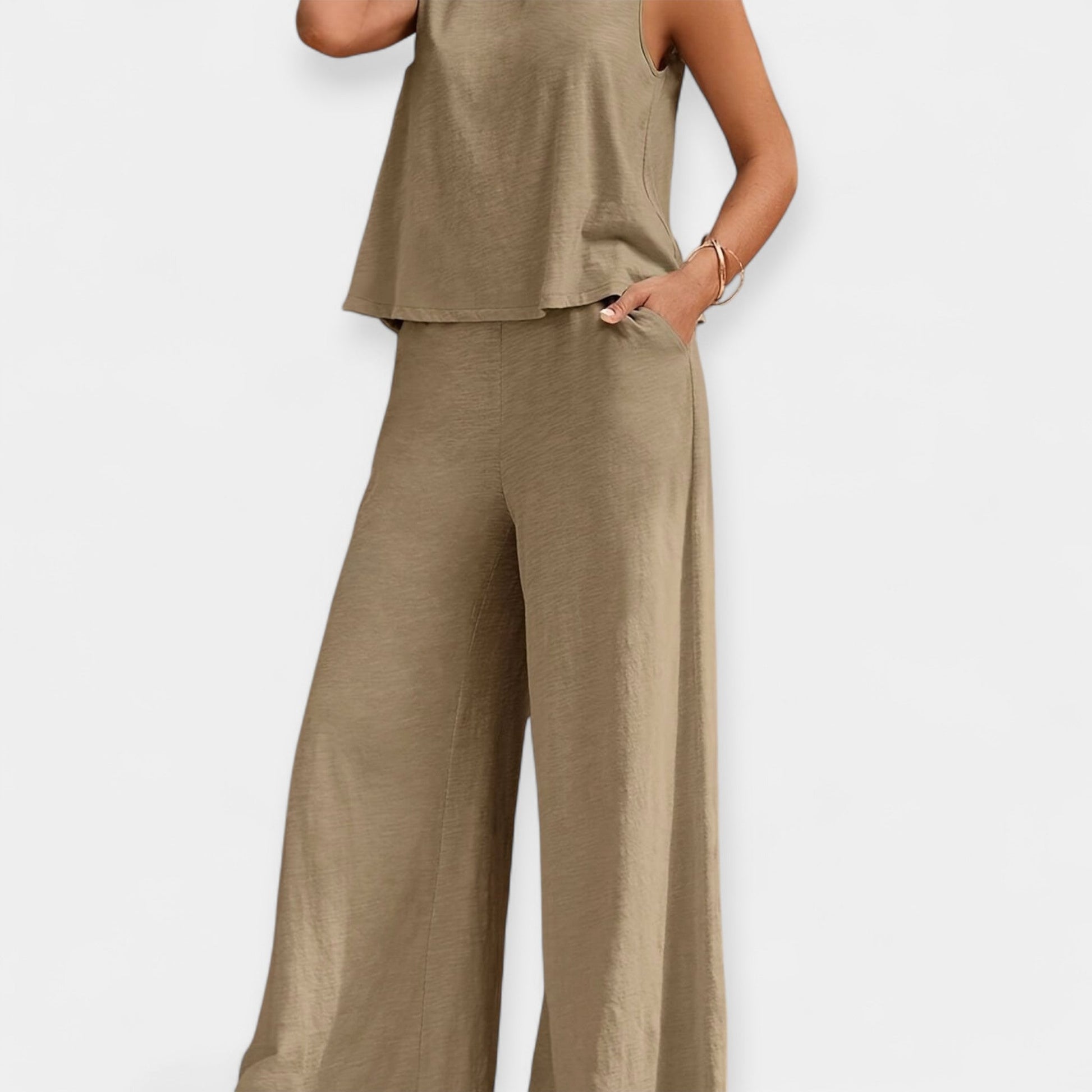 Impozantní jednobarevná sada, která vyzařuje dynamiku a ženskost. Bezramenný top se kombinuje s širokými kalhotami pro bezstarostný styl a každodenní pohodlí. Lehká tkanina ji činí ideální pro teplé dny na jaře a v létě.