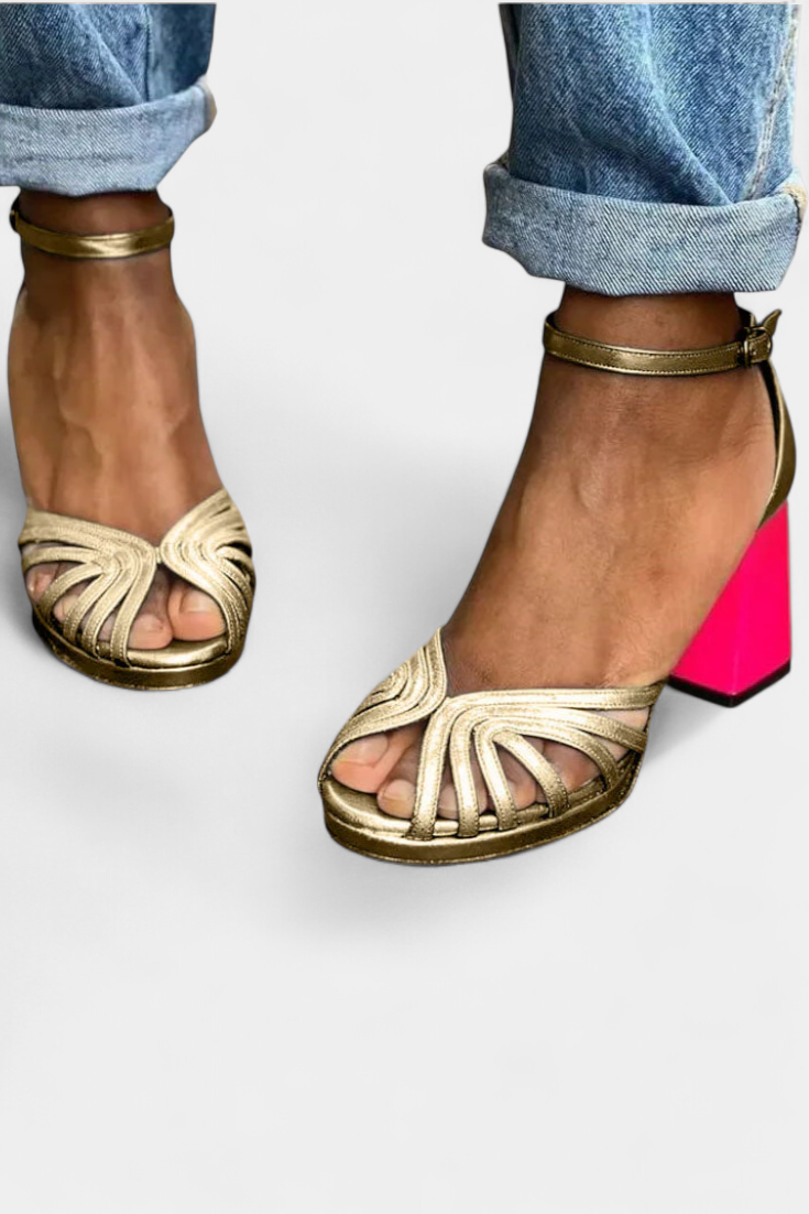 Con un equilibrio perfecto entre glamour y comodidad, las sandalias Solea elevan cualquier conjunto con su detalle dorado y su diseño atemporal. El tacón grueso aporta estabilidad para caminar con seguridad, mientras que la tira al tobillo realza la silueta del pie con un toque femenino y sofisticado. Ideales para llevar desde la mañana hasta la noche sin esfuerzo.