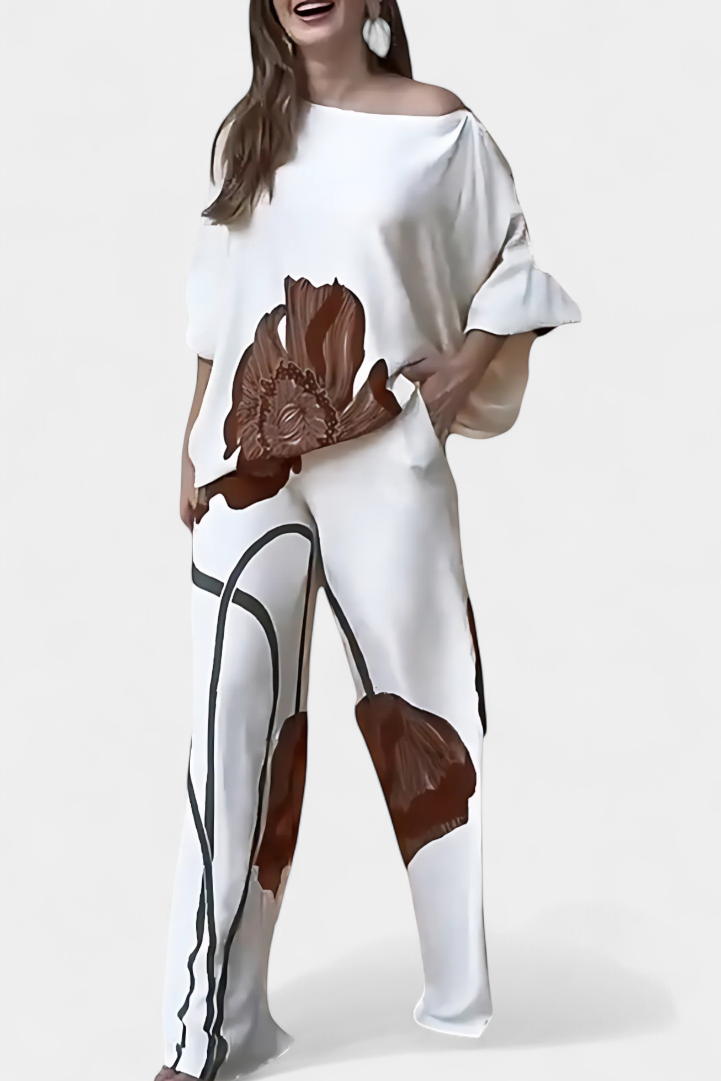 Dvoudílná souprava Sybella s květinovým vzorem, odhalenými rameny a rovnými kalhotami