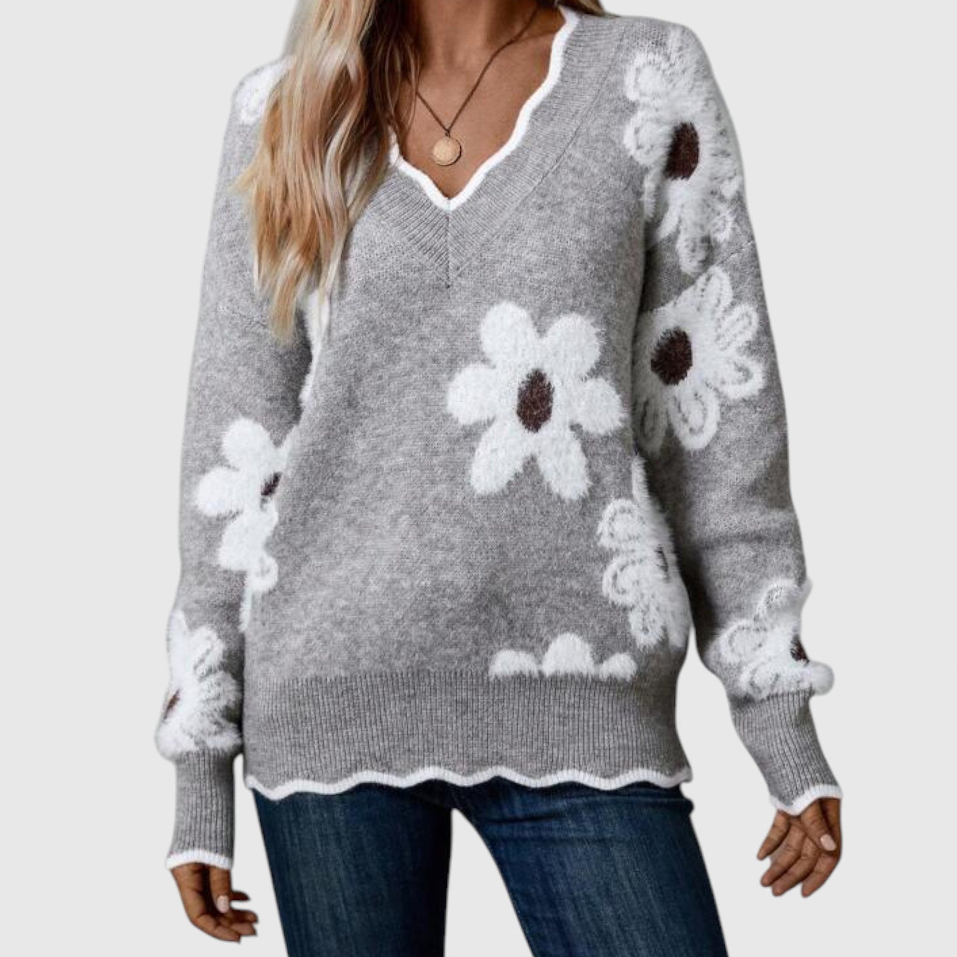 Svetřík Thea kombinuje útulné pohodlí s nenucenou elegancí, díky čemuž je výjimečnou volbou pro chladnější dny. S lichotivým V-šímkem a elegantním květinovým vzorem přináší kouzlo a sofistikovanost do vašeho každodenního šatníku. Měkký, lehký a snadno nositelný, Thea vás zahřeje, aniž by vás zatížil — ideální pro neformální chvíle i elegantní příležitosti.